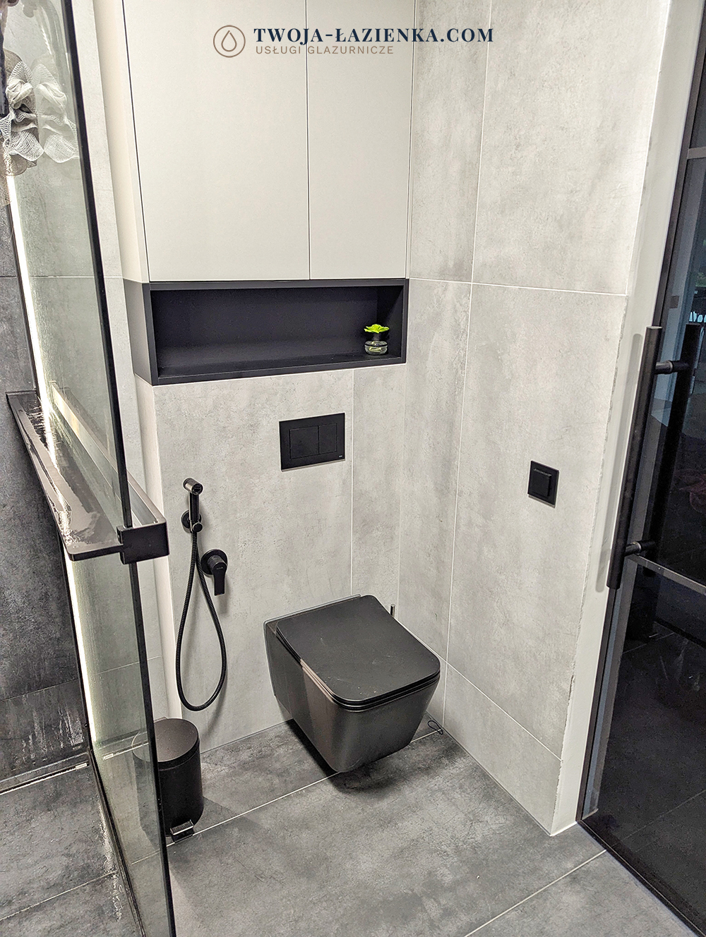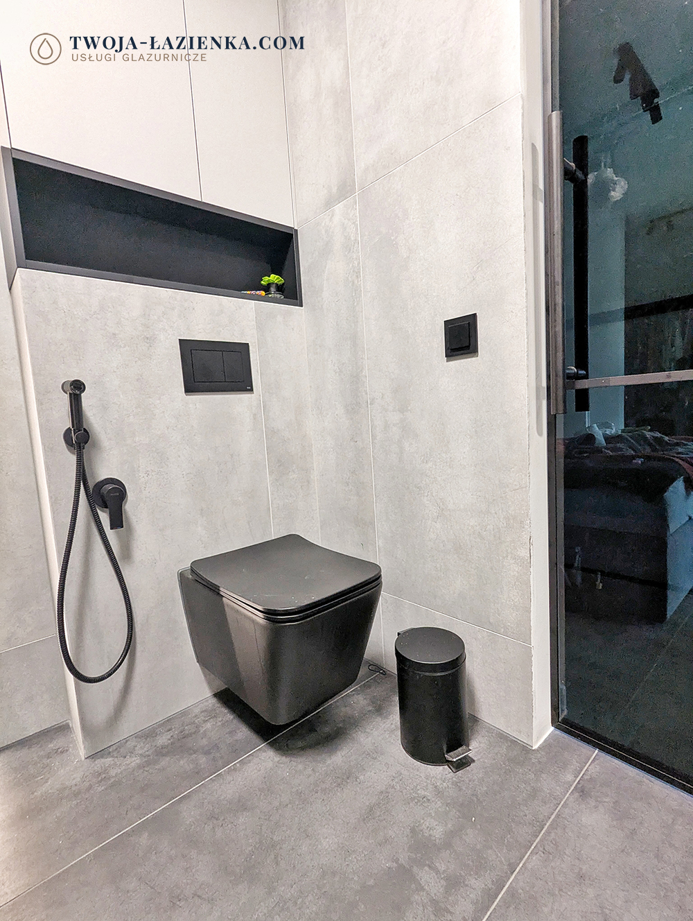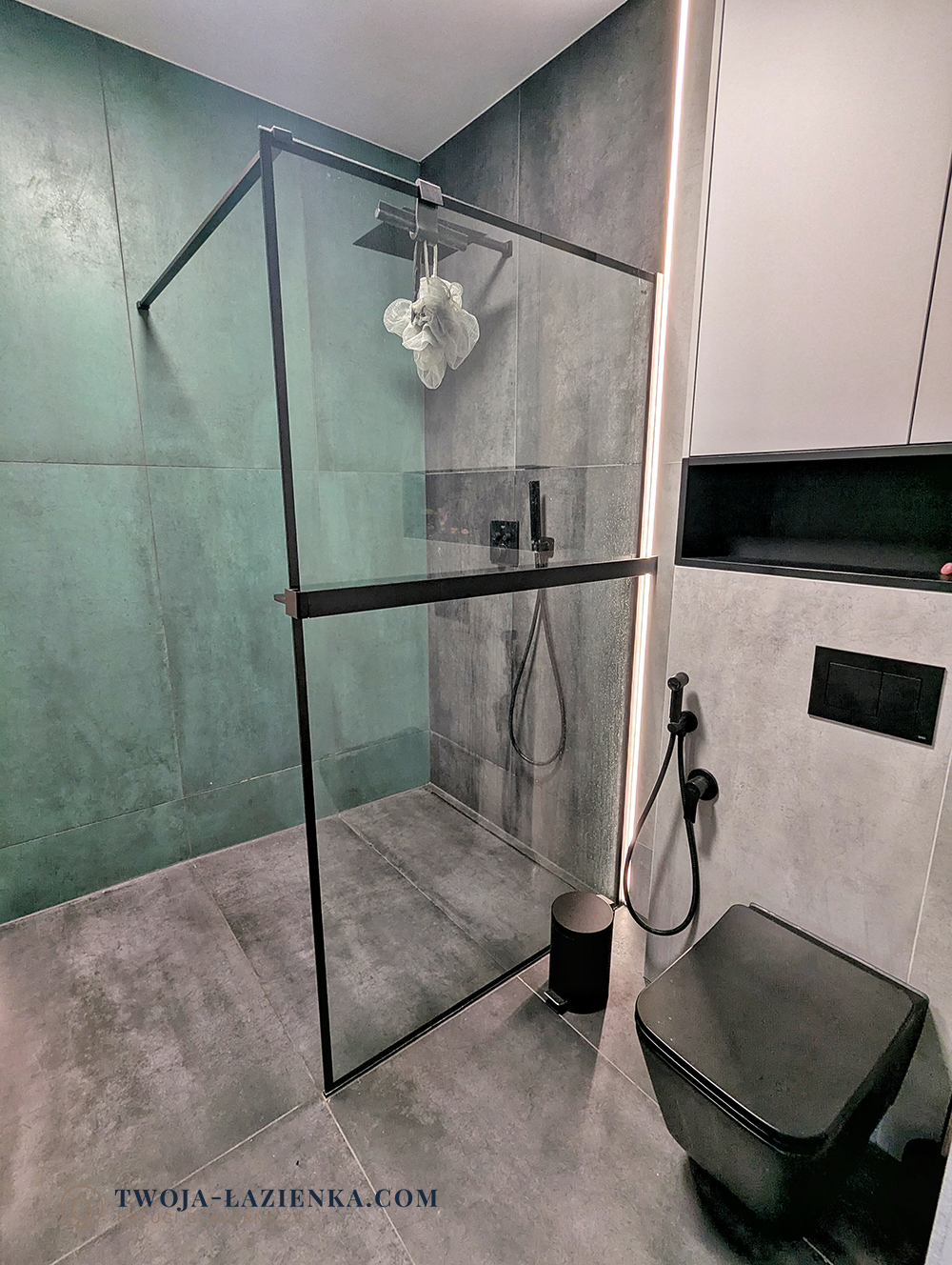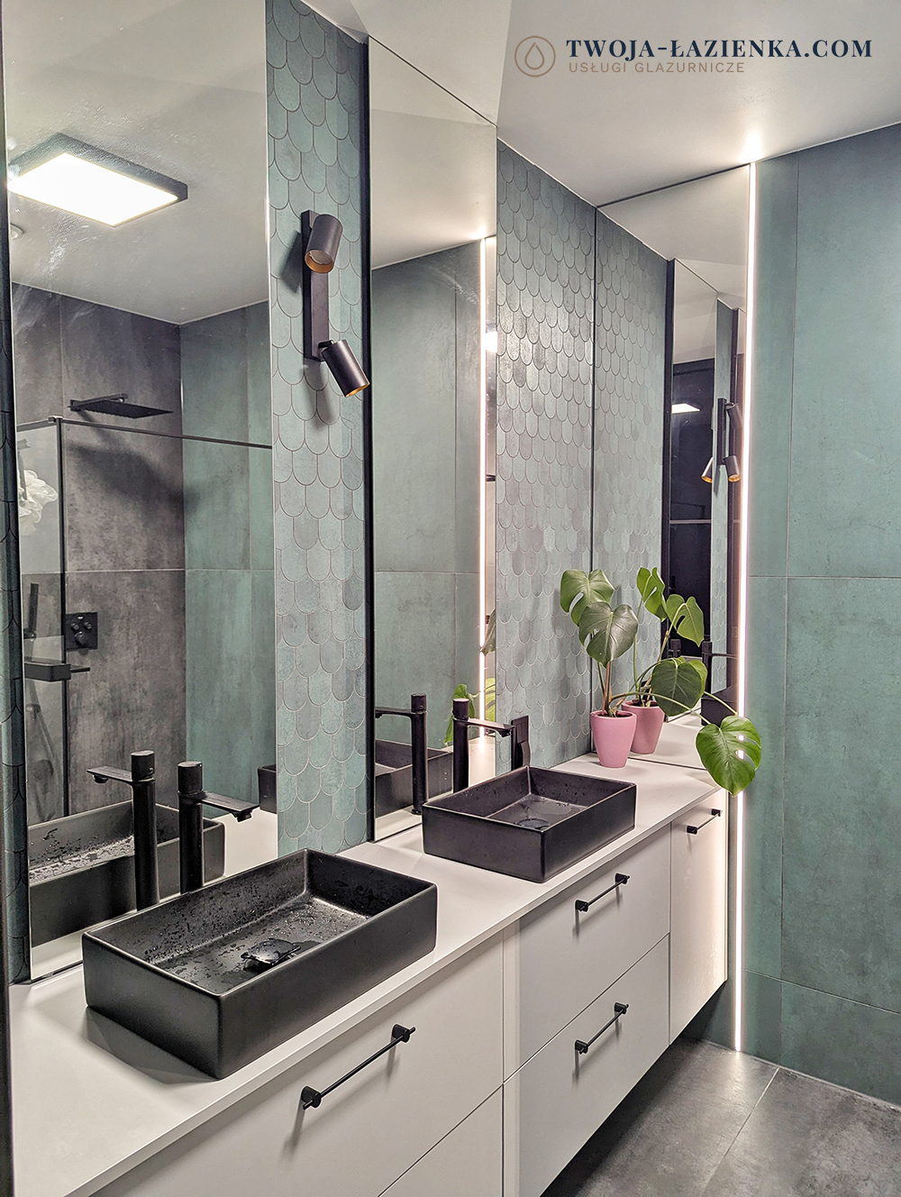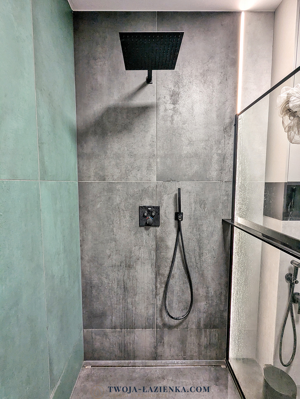 Prezentujemy realizację łazienki, w której dominuje betonowa szarość, matowa czerń oraz akcenty w kolorze butelkowej zieleni. Surowość betonu została przełamana elegancką ceramiką i nietuzinkowym wzorem płytek w kształcie rybiej łuski, tworząc harmonijną przestrzeń pełną charakteru.